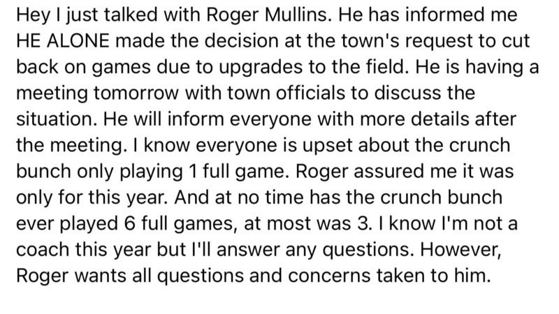 Listen up People, Its floating in the air now that Roger Mullins is the one who canceled the games and not allowing our kids to play on the football field at bullit park in BSG due to the upgrades to the field but the upgrades were finished on the field yesterday so try again. There is gonna be a town meeting tomorrow in which Roger Mullins will attend . Why soo busy on a sunday guys? What’s sad is there are some people out their that really think this is up for debate, trying to shame us for standing up for the kids which is terrible when you sit and think about it. When did we allow ourselves to get here, where now we have to have a town meeting to try to resolve the problem Roger Mullins caused . That’s why I will be creating another petition to have him resign from his position from the Union P-Nut Football league. It keeps being drilled into our head that if anyone has any concerns too take it to Roger Mullins but When concerns are actually brought to him he still waves them off . Maybe it’s time for him to step down and someone that will actually listen to the parents and coaches take his place . Someone who will fight tooth and nail for these kids and not just sit back and let the town and league run over them for there little events that are more important. I’ll keep everyone posted just follow me on here .