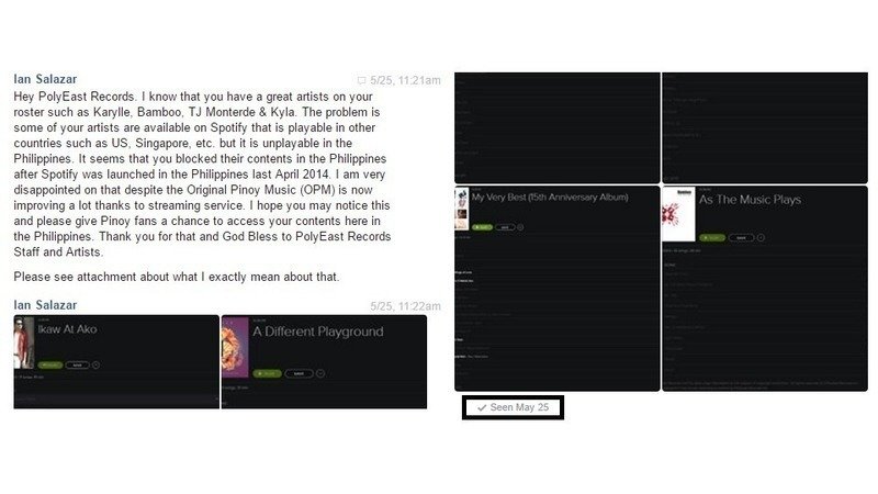 I asked them few days about that issue for not allowing their artists' tracks playable on Spotify for Philippine users and they didn't said any sentence or paragraph about this but only one painful word they gave it to us. Look at the box.