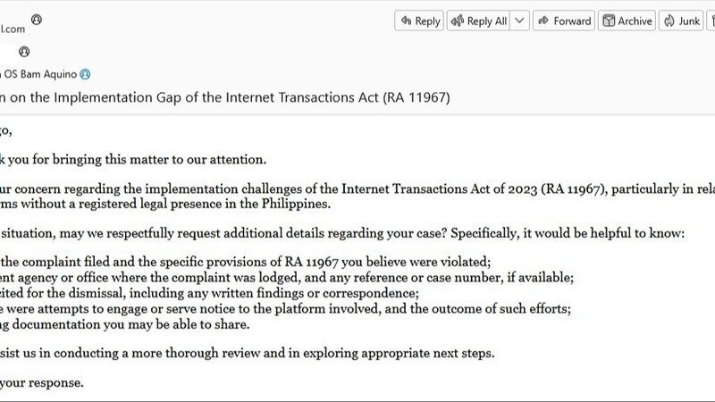 Petition updateAmend the Internet Transactions Act (RA 11967) for better Reddit, FB, IG, X accountabilityThe Office of Sen Bam Aquino replied and ask for more details about the complaint