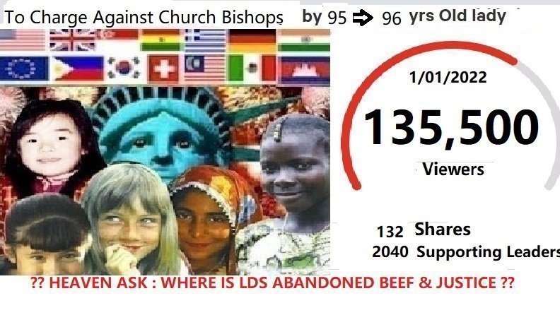 1/01/2022 135,500+ Petition Viewers pleading Heaven CARRYING OUT REMAINING MISSIONS ON MISSING LDS BEEF & JUSTICE .. . Church & Leaders are alleged fraud setting linked with followers to invade/occupied personal property since Aug-2020 & has caused massive damages & mental nerve pains to the 95-yrs old lady as well as her victimized family.. . . THE remaining issues that Church Leaders need to resolve : 1. Long over due rents during 2020-2021 (8/2020 - 12/2021) . 2. Randalism property massive Damages 3. Punitive mental/nerve damages caused to Amy (95+) & community <Payment 3 will be donated/shared with public charities and PBA.> . . . . "WE KEEP ON PRAYING HEAVEN WHERE IS THE LDS BIGLOVE & JUSTICE ?! " .: . Please support, review & share . . .