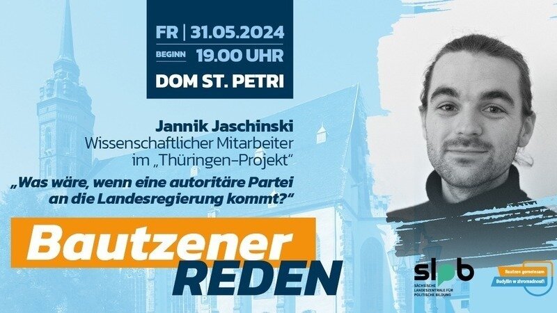 „Was wäre, wenn eine autoritäre Partei an die Landesregierung kommt?" – Diese Frage steht im Mittelpunkt der nächsten Bautzener Rede am Freitag, dem 31. Mai. Gast ist Jannik Jaschinski. Der Jurist erläutert beim Gesprächsformat im Dom St. Petri mögliche Szenarien, wie extremistische Parteien die Verfassung in Deutschlands ganz legal unterwandern könnten. Die Bautzener Rede beginnt um 19 Uhr.