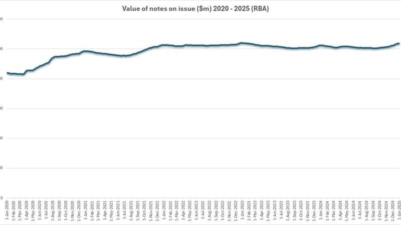 Last week there was $103.7 million worth of Australian cash notes circulating in the community. That's UP around $3 billion since October.
