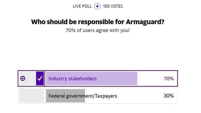 Most Australians understand the banks are responsible for distributing cash, according to a Yahoo News poll. 70% of respondents have voted "industry stakeholders" to pay for Armaguard's costs, rather than taxpayers (30%).