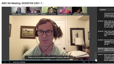 [image description: video conference screen with Commissioner Toomajian speaking, overlaid with closed captioning that reads, "There's a lot of comments being posted in Q and A, and that." In smaller windows above Commissioner Toomajian, from left to right, are the screens of Commissioners Hudson, Brown, Alcorn, Zimny, and Phillips-Gilbert. Text above the Commissioners' windows reads, "ANC 6A Meeting-20200709-1." To the right of the Commissioners' windows is the meeting transcript capturing portions of Commissioners' statements acknowledging that constituents had comments during the meeting but would not be permitted to speak.]
