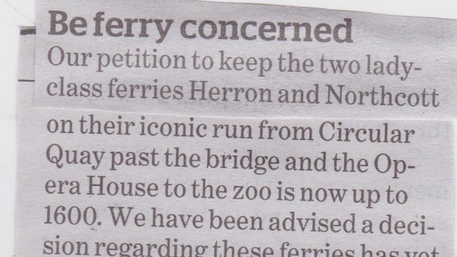 Please ask all friends and family to sign the petition because the more signatures we get the better. Every signature counts! If you can please make colourful posters for Sunday at 2pm at Taronga Zoo wharf. You can make a difference by just turning up to show your support. It is only 1 hour out of your day to hopefully see the Ladies on the harbour for the next 50 years. Letter in the SMH again today!
