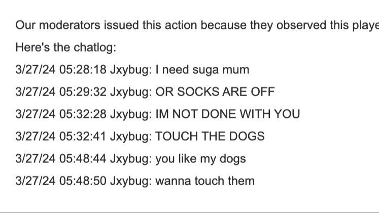 It would be much appreciated if you would take into consideration signing my petition and sharing my story to appeal my permanent ban because it is honestly ridiculous that I was banned over feet jokes. We all know in the AJ community that most of you have said way worse on the game and have seen worse by players such as MissMel who is a 35 year old pedophile who harasses players in a sexual engaging way.