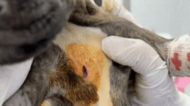 That is a bite wound across his tiny chest. One of several. Infected. Untreated. Left to rot. Tiger had been used as bait in a suspected dogfighting ring.