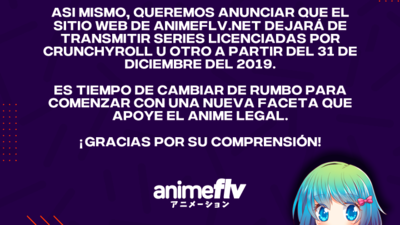 veran animeflv deja de transmitir animes licenciados por Crunchyroll, Netflix y Sentai Filmworks.etc dejando así una muy mínima cantidad de animes para transmitirse normalmente y con ello el fin del anime pirata ya que aunque no lo crean la industria del anime no esta bien y todo es gracias a la pirateria por ello hago esta propuesta en la cual todos ganamos,¿y cual seria esa propuesta? facil que Que Animeflv se convierta en una página legal y que mantenga tal cual como esta y que nosotros paguemos una pequeña cantidad de dinero para apoyar a la industria de anime y asi animes que no conoce mucha gente y que son buenos no queden en el olvido y tambien para seguir viendo animes en emision.