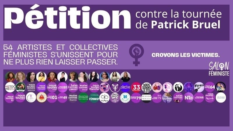 Nous, collectives féministes, associations militantes pour les droits et la protection des femmes et des enfants, artistes, demandons à ces villes de permettre à la justice de faire son travail et d’annuler la venue de Patrick Bruel.