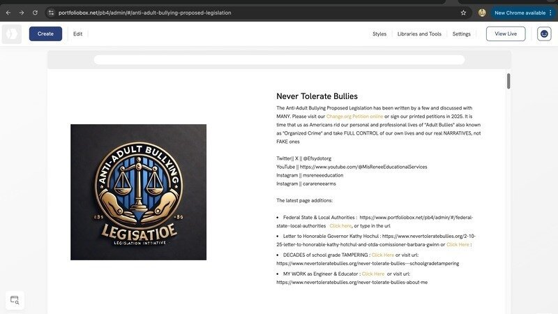 The Anti-Adult Bullying Proposed Legislation has been written by a few and discussed with MANY. Please visit our Change.org Petition online or sign our printed petitions in 2025. It is time that us as Americans rid our personal and professional lives of "Adult Bullies" also known as "Organized Crime" and take FULL CONTROL of our own lives and our real NARRATIVES, not FAKE ones