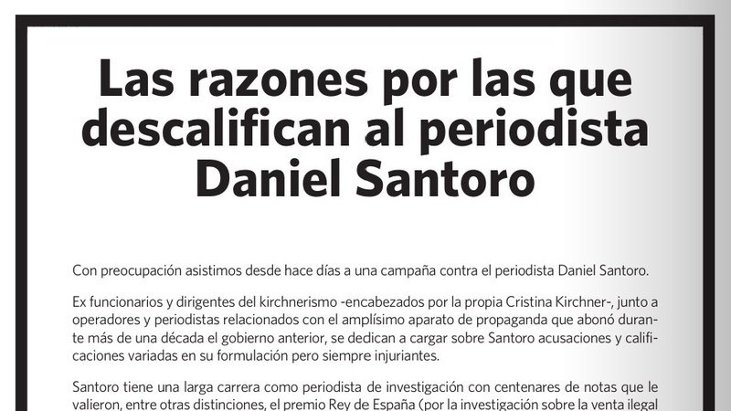 Magdalena Ruiz Guiñazú, Joaquín Morales Solá, Santiago Kovadloff, Alfredo Leuco, Norma Morandini, Cristina Pérez y muchos más, firmaron una solicitada de apoyo a Daniel Santoro, ante el intento de descalificarlo y pretender enredarlo en una ridícula red de extorsión.