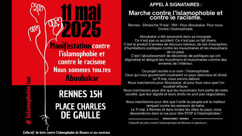 Appel à la manifestation contre l'islamophobie et le racisme, à Rennes le 11 mai.