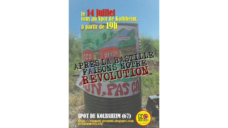 Vendredi 14 juillet, à partir de 19h, vous êtes invité à venir partager un moment festif au spot de Kolbsheim. Chacun-e apporte de quoi boire et manger, dans un esprit de partage autour d'un feu tard le soir et ainsi échanger sur la lutte, nos craintes et nos espoirs, ... SOYONS NOMBREUX !
