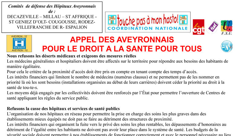 APPEL DES AVEYRONNAIS POUR LE DROIT A LA SANTE POUR TOUS