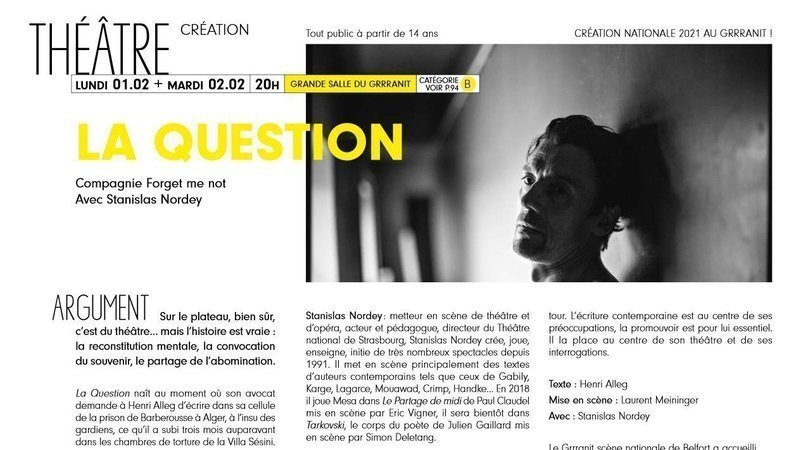 Un des évènements de la nouvelle saison de la Scène nationale de Belfort les 1er et 2 février 2021 sera la première de l'adaptation du texte de "la Question" mise en scène par Laurent Meininger avec Stanislas Nordey, directeur national du théâtre de Strasbourg.