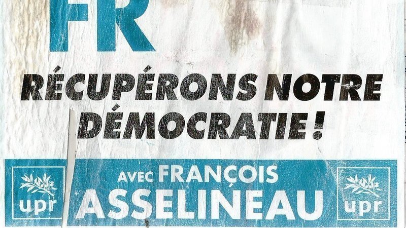 On nous dira, par exemple, qu'il faut "restaurer la démocratie", "rendre le pouvoir au peuple", etc. C'est un slogan de ce genre que nous trouvons sur un tract de l'UPR, le parti souverainiste de François Asselineau, candidat aux élections présidentielles de 2017 partisan du Frexit, c'est-à-dire la sortie de la France de l'Union européenne, comme l'Angleterre l'a fait. Ce parti est classé à droite mais, droite ou gauche, les slogans sont du même tonneau.
