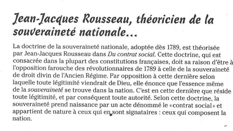 Guillaume Bernard et Frédéric Monera, les deux auteurs du livre de vulgarisation politique « L’instruction civique pour les Nuls » ne sont pas les seuls à affirmer i) que Rousseau est l'auteur de la théorie de la souveraineté de la nation et ii) que cette théorie a été adoptée par l’Assemblée constituante de 1789. Nous pouvons trouver les mêmes affirmations dans les manuels scolaires d’histoire. Ainsi, le manuel d'histoire Malet-Isaac dit ce qui suit :