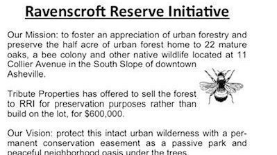 We are in Phase 2 of preserving the half acre of urban forest at 11 Collier Ave in the South Slope of downtown Asheville. Tribute Properties has agreed to sell the urban forest to Ravenscroft Reserve Initiative for preservation purposes, for $600,000. We have started a charitable GoFundme with a fiscal sponsor, so all contributions are eligible to be tax deductible.