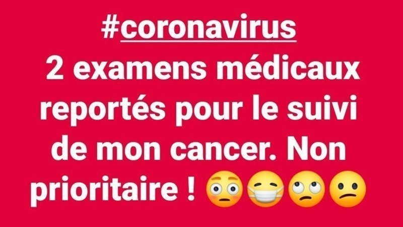 Je viens de recevoir un appel de l'hôpital pour me dire que mes examens de suivi du cancer du rectum (échographie abdominale, coloscopie, rendez-vous avec le chirurgien) étaient reportés à une date indéterminée.