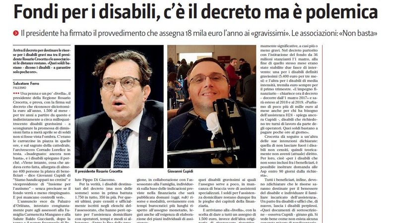 Sul Giornale di Sicilia di oggi è stata riportata la notizia sulla pubblicazione del Decreto regionale sul Fondo per la disabilità e sulle dichiarazioni del presidente Crocetta su quali misure sono state previste per le persone con disabilità gravissime. Nell'articolo ci sono alcune mie dichiarazioni in merito al decreto appena esitato dalla commissione salute.