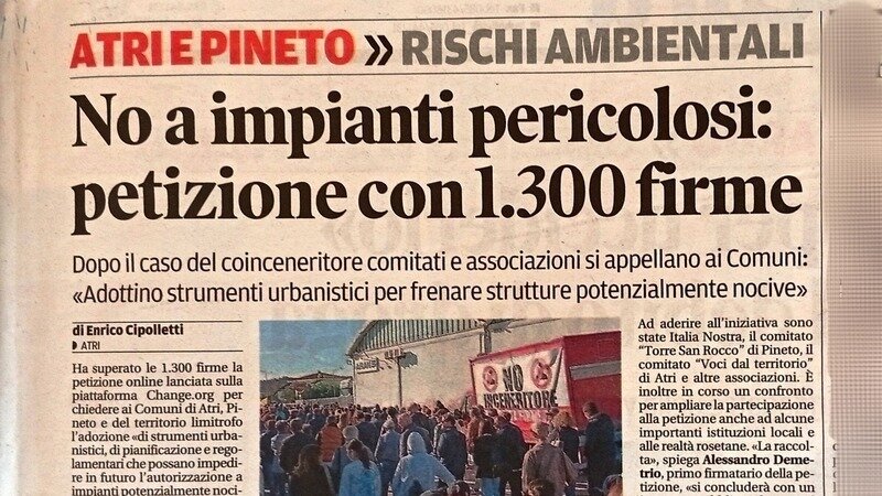 Oggi sul quotidiano "Il Centro": L’autorizzazione all’impianto di incenerimento a ridosso delle abitazioni della contrada Stracca di Atri, non è l'oggetto, ma solo lo spunto da cui è nata questa iniziativa: abbiamo constatato, ancora una volta, come troppo spesso le istituzioni locali non utilizzino a pieno i margini di discrezionalità che l’ordinamento riconosce loro, trovandosi impreparate di fronte a decisioni calate dall’alto. Ringraziamo i cittadini e le associazioni che sempre più numerose stanno rendendo questa mobilitazione forte, consapevole e trasversale. La nostra non è una battaglia contro qualcuno, ma un’azione per il futuro: chiediamo ai Comuni di dotarsi degli strumenti giusti per proteggere il territorio.