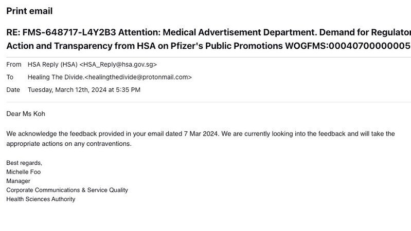 Thank you for acknowledging our initial communication on 7 March 2024. While we appreciate the Health Sciences Authority's (HSA) willingness to investigate the concerns raised, the growing urgency of these issues, underscored by recent developments and public anxiety, demands a clear and expedited review process. The absence of a defined timeframe not only undermines public confidence but also risks public health at a time when transparency and swift action are paramount.