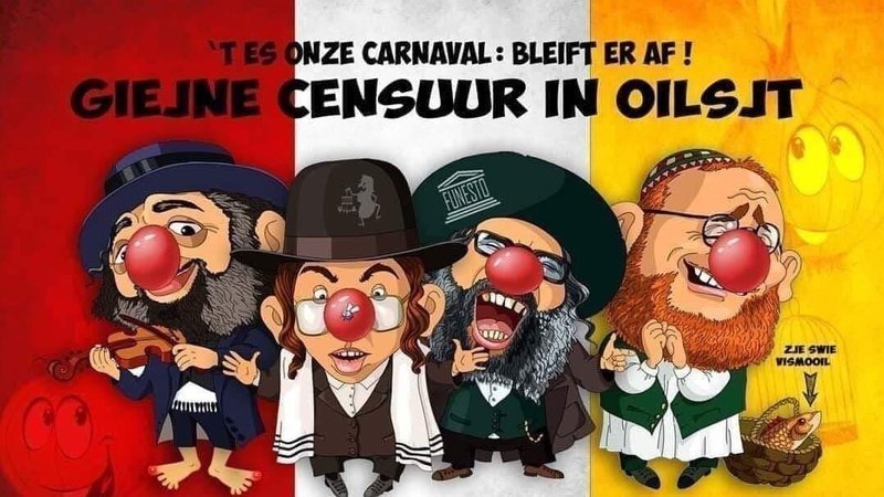 This poster for the 2020 Aalst carnival, which will take place in February, shows that there will be another stereotypical attack on the Jewish community in Belgium. One shop has stocked over 250 Jewish 'costumes', complete with purses full of gold coins.