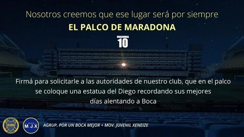 Desde el Mov. Juvenil Xeneize, junto con la Agrup. Por Un Boca Mejor queremos pedirle a las autoridades del club que en el palco se ubique una estatua recordando los mejores días del Diego alentando a Boca.