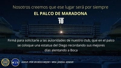 Desde el Mov. Juvenil Xeneize, junto con la Agrup. Por Un Boca Mejor queremos pedirle a las autoridades del club que en el palco se ubique una estatua recordando los mejores días del Diego alentando a Boca.