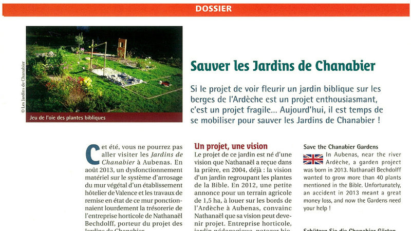 "Si le projet de voir fleurir un jardin biblique sur les berges de l'Ardèche est un projet enthousiasmant, c'est un projet fragile... Aujourd'hui, il est temps de se mobiliser pour #SauverLesJardinsDeChanabier !" est une citation de cet article.