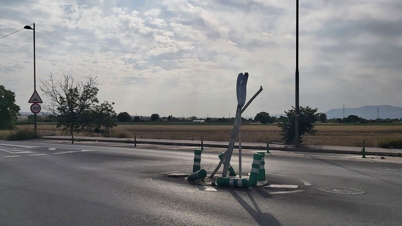 Hola, en la madrugada de este viernes a sábado pasado, en las fiestas del Corpus, un coche que venía en dirección Granada, se llevó por delante las señales de la mini rotonda instalada por el Ayuntamiento de Armilla. El coche volcó y recorrió unos cincuenta metros aunque afortunadamente no hubo que lamentar víctimas. Todavía quedan las marcas sobre el asfalto y los restos del coche en el trayecto recorrido mientras estaba volcado. A todo esto la iluminación del vial vuelve a estar como en un principio antes de esta denuncia, a oscuras y con la mayoría de los focos instalados fundidos o apagados. Por supuesto, el Ayuntamiento de Armilla y Fomento de la Junta mirando para otro lado.