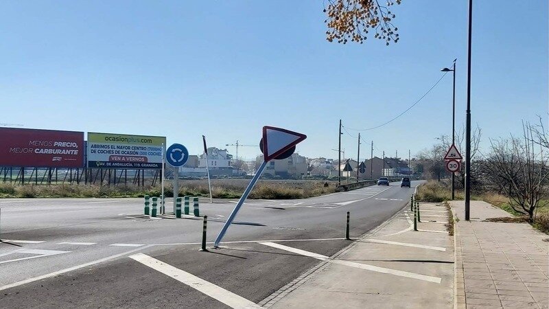 Hola de nuevo, os remito una fotografía tomada hoy mismo 24 de enero de 2024. Como veis, una vez más la señal de la mini y chapucera rotonda está doblada por una colisión. Si observáis con detalle, al fondo, la que está en sentido contrario, también está doblada por otro golpe.