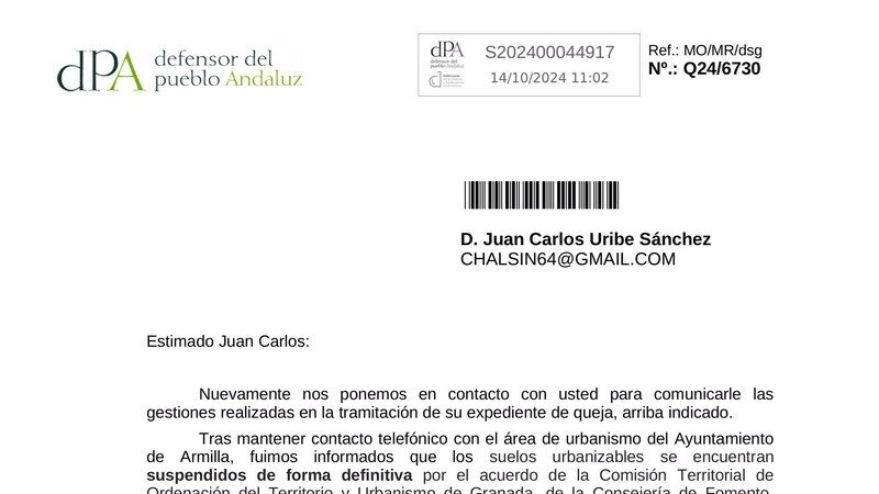 Buenos días, me comunican desde la Oficina del Defensor del Pueblo Andaluz que la reunión que había programada a tres bandas con el Ayuntamiento de Armilla ha tenido que quedar suspendida así como el procedimiento de reclamación de desdoblamiento del vial. El motivo no es otro que el haber interpuesto un recurso contencioso administrativo el Ayuntamiento de Armilla contra la Consejería de Fomento de la Junta de Andalucía. Según el Ayuntamiento de Armilla los suelos urbanizables de dicha zona han quedado suspendidos así como el PGOU de forma definitiva por parte de la Junta. Todo esto se ha llevado al Juzgado de lo Contencioso Administrativo número cinco de Granada bajo el número de procedimiento ordinario 329/2024. El Defensor del Pueblo andaluz en estas circunstancias no puede seguir con el procedimiento pues está pendiente de resolución judicial. También según este recurso hasta que no se resuelva el procedimiento no es posible avanzar en proyectos urbanísticos claves para el municipio como el desdoblamiento del vial de la avenida Cristóbal Colón, la ampliación del cementerio o el desarrollo de otras infraestructuras. Todo esto según informa el Ayuntamiento de Armilla. En principio, el procedimiento y el recurso contencioso administrativo está puesto pero vamos a ver si eso influye en la ampliación del cementerio u otras obras que ya han sido o van a ser subvencionadas y aprobadas por la Diputación de Granada con destino al Ayuntamiento de Armilla en los Planes Provinciales de obras y servicios. En ese mismo escrito que el Ayuntamiento de Armilla ha enviado el Defensor del Pueblo andaluz se indica textualmente que "en aras de mitigar los riesgos asociados al estado actual de la vía y pese a la limitaciones impuestas por la suspensión del pego el Ayuntamiento ha implementado una serie de medidas provisionales para garantizar la seguridad vial como la instalación de puntos de iluminación adicionales y la mejora de la señalización horizontal y vertical."
