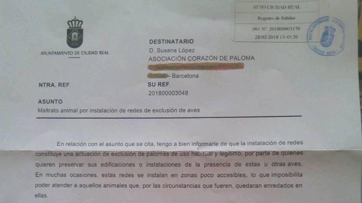 Petition updateDeclaren Ciudad Real ciudad amiga de los animalesContestación del Ayuntamiento por las "redes de exclusión".