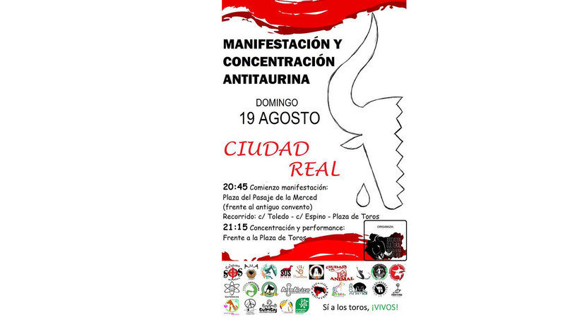 Ya tenemos el cartel de la manifestación y concentración del domingo que viene, día 19 de agosto, en Ciudad Real con motivo de los 18 toros que se van a torturar entre los días 17 y 19 en nuestra ciudad.