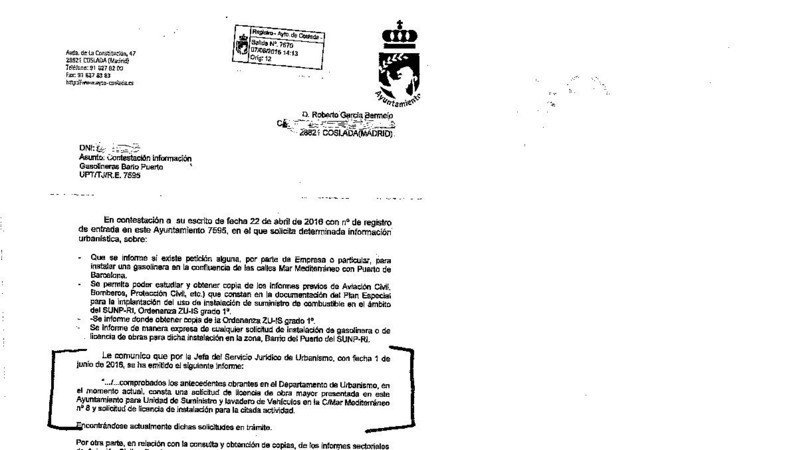 Según me ha informado la Concejalia de Urbanismo, Vivienda, Vías y Obras y Medio Ambiente en su Escrito de 2 de junio que adjunto, "...consta una solicitud de licencia de obra mayor presentada en este Ayuntamiento para Unidad de Suministro y lavadero de Vehiculos en la C/ Mar Mediterraneo nº 8 y solicitud de licencia de instalación para la citada actividad. Encontrándose dichas solicitudes en trámite".