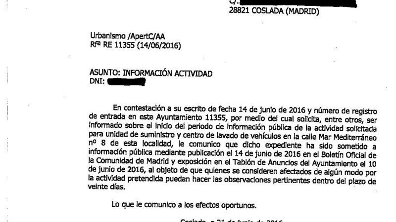 Desde el 14 de junio se puede acudir al Ayuntamiento de Coslada ( planta 4ª- Urbanismo) a ver el expediente de solicitud de concesión de Licencia de obra y actividad de la Gasolinera que se pretende construir en el solar de la Calle Mar Mediterraneo y presentar alegaciones a la misma.