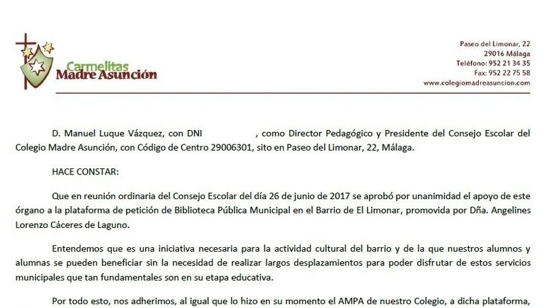 Acorde con los pasos andados por su AMPA (junto con otras cinco más), el Colegio Madre Asunción entiende la iniciativa de esta plataforma necesaria para la actividad cultural del barrio y de sus alumn@s, por considerar que un servicio municipal como la biblioteca en el entorno es fundamental en su etapa educativa, adhiriéndose a la misma.
