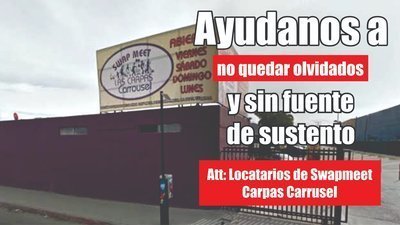 Nosotros, locatarios de Swapmeet Carpas Carrusel, necesitamos se preste atención a la problemática que desde hace más de dos meses nos está afectando terriblemente. La contingencia presentada sigue consumiéndonos económicamente, cada día se hace más y más complejo encontrar la manera de obtener los ingresos necesarios para sustento y pago de servicios. Ya no podemos más.