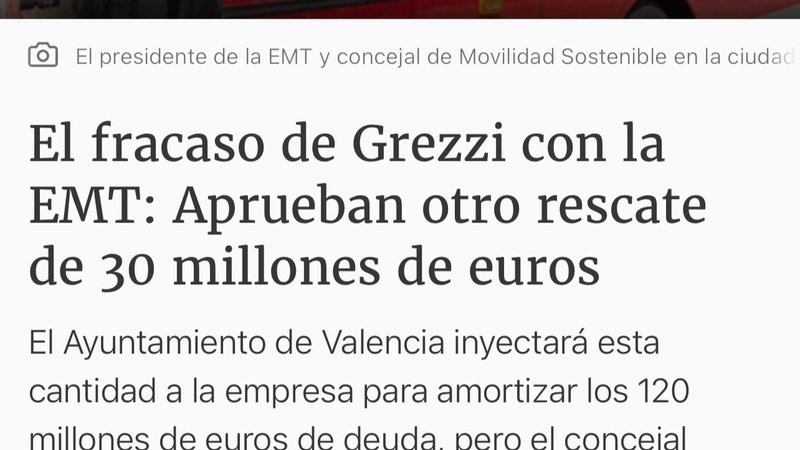 El Ayuntamiento de Valencia inyectará esta cantidad a la empresa para amortizar los 120 millones de euros de deuda, un desastre de gestión tras el robo de los 4 millones de €, la deuda con Hacienda de 10,5 millones, el incendio de autobuses, las huelgas, el desastre en el cambio de líneas y su baja frecuencia… y todavía nadie sin dimitir.