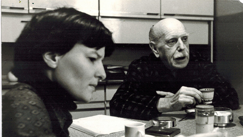 En la foto, Renau en su cocinita en Berlín (y para terminar con humor, el de la calva es Renau, la otra soy yo, hace muchos años)