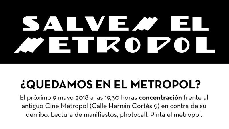 El miércoles 9 de mayo de 2018 a las 19:30h os invitamos a participar en la concentración cívica que tendrá lugar en la puerta del antiguo Cine Metropol de Valencia (Calle Hernán Cortés nº9) en contra de su derribo.