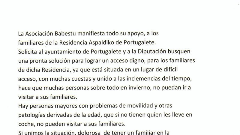 Dar las gracias a BABESTU, asociación de familiares residentes, que nos hace llegar su apoyo a través de esta carta.