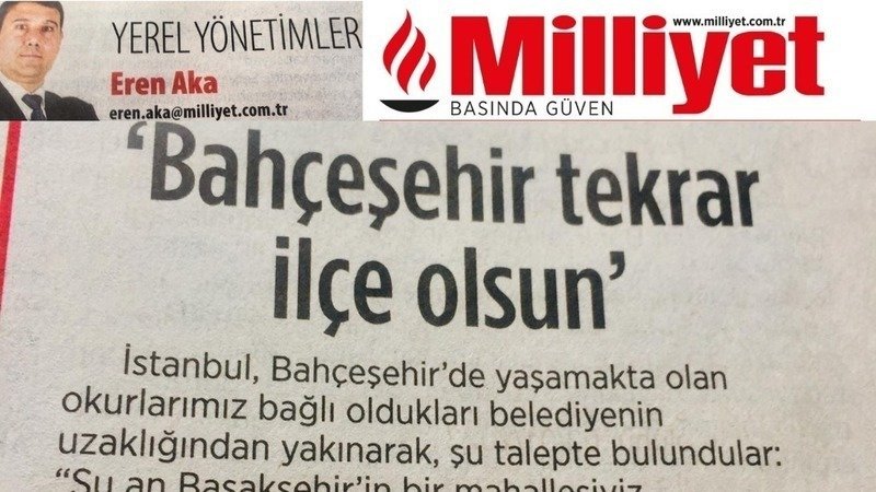 Milliyet Gazetesi Yerel Yönetimler Köşesi Yazarı Eren Aka "Bahçeşehir İlçe Olsun" kampanyamıza dair bölgemizden komşularımızın gönderdiği haklı talebi bugün köşesine taşıdı. Teşekkürler @eren_aka