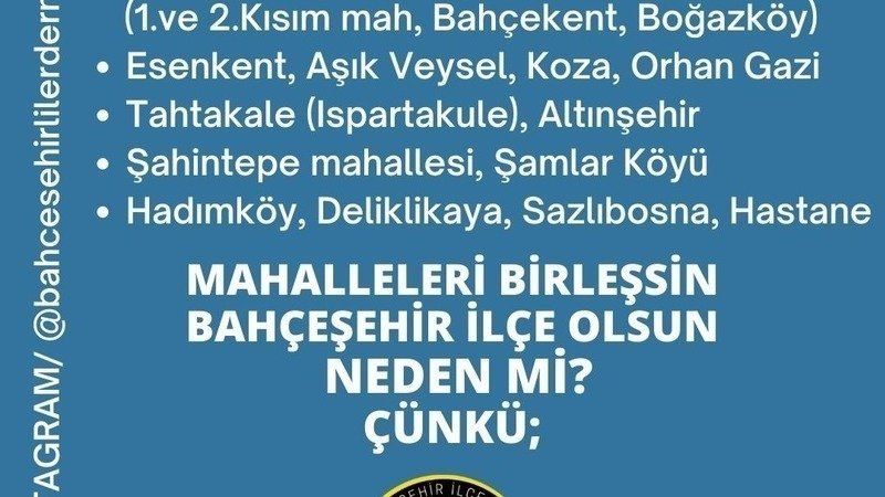 Kampanya güncellemesiBahçeşehir-Esenkent-Ispartakule-Hadımköy-Bahçekent-Şamlar-Şahintepe mahalleleri birleşsinBahçeşehir Neden İlçe Olmalı? Çünkü -1