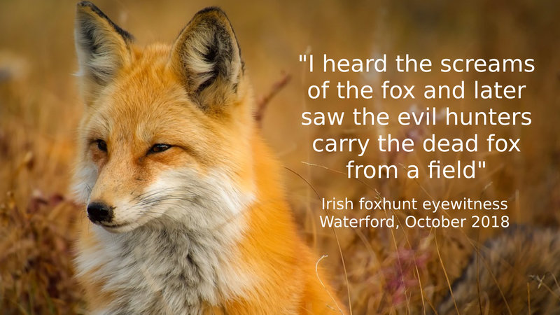 "I heard the screams of the fox and later saw the evil hunters carry the dead fox from a field" - Irish foxhunt eyewitness, Waterford, October 2018. How many more foxes will suffer and die before the Irish Government finally bans this obscene bloodsport?