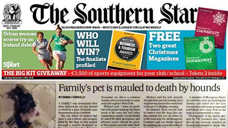 Cruelty and carnage during Cork hunt: Pet cat mauled to death, out-of-control dog hit and killed by car, with vehicle damaged and driver distressed. Read more in the Southern Star report and join us as we renew calls on the government to ban hunting with packs of hounds...