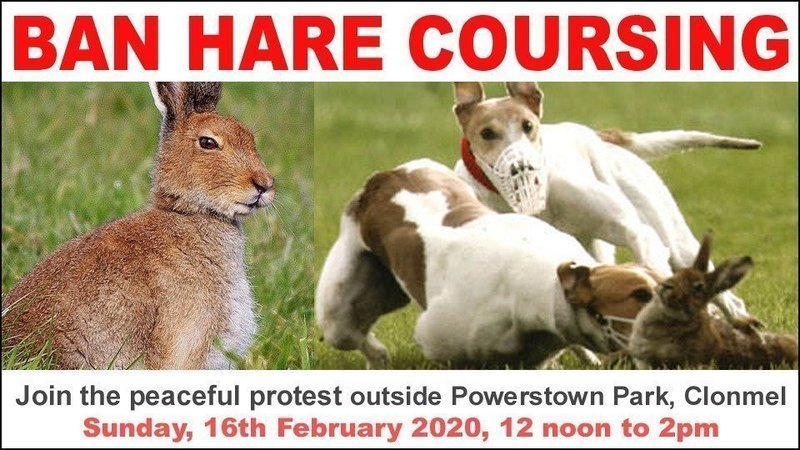 Please join the "Ban Hare Coursing" peaceful protest outside Powerstown Park in Clonmel this Sunday 16th February 2020 from 12 midday to 2pm.