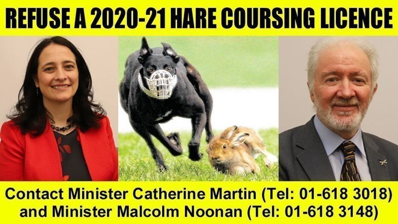 HELP THE HARES: Please urgently contact Green Party Ministers Catherine Martin (who has responsibility for wildlife) and Malcolm Noonan (who has responsibility for the National Parks and Wildlife Service) and urge them to REFUSE a 2020-21 hare coursing licence.