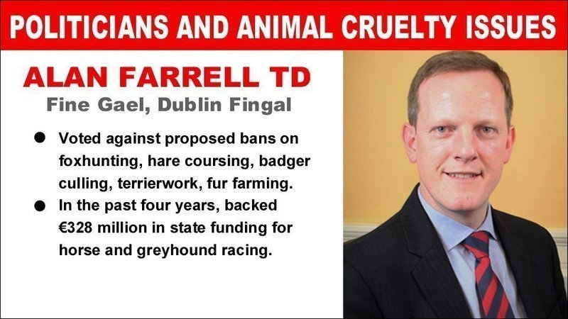 Political Focus: Alan Farrell TD (Fine Gael, Dublin Fingal) - Voted against proposed bans on foxhunting, hare coursing and badger culling • In the past four years, he has voted in favour of €328 million of taxpayers’ money being channelled into horse racing and greyhound racing...
